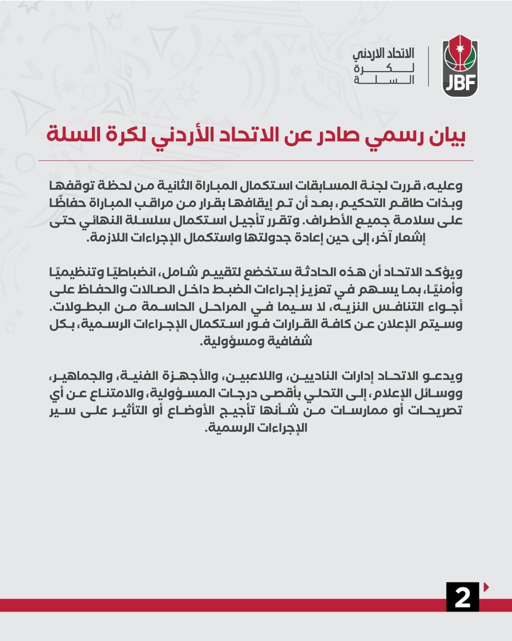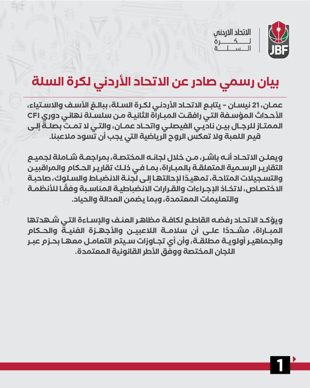 قرر الاتحاد الأردني لكرة السلة، استكمال مباراة ناديي الفيصلي واتحاد عمّان الثانية من سلسلة نهائي دوري CFI الممتاز للرجال من لحظة توقفها وبذات طاقم التحكيم، بعد أن جرى إيقافها بقرار من مراقب المباراة حفاظا على سلامة جميع الأطراف.