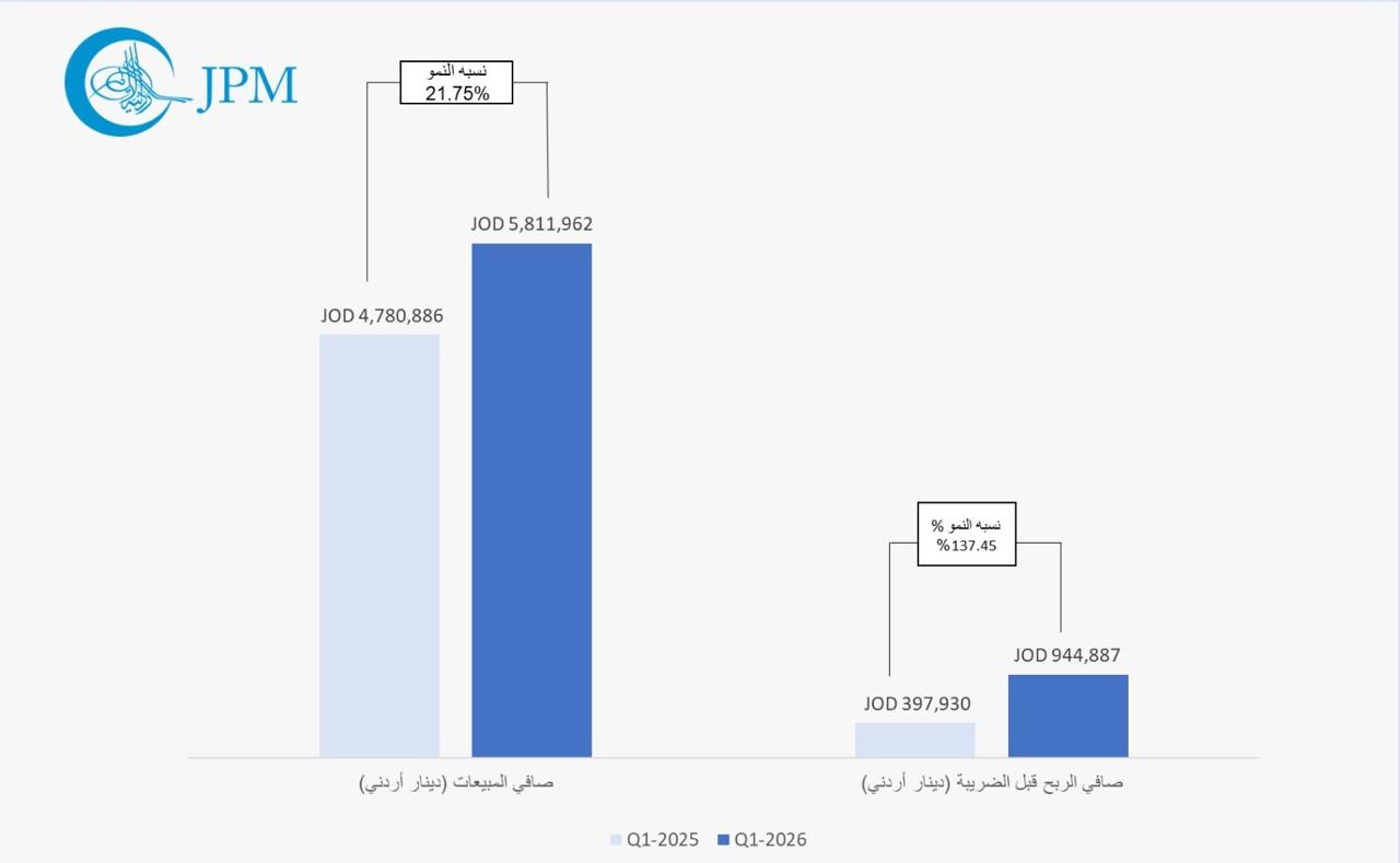 حيث حققت الشركة صافي مبيعات خلال الربع الأول من العام الحالي 2026 بلغ 5,811,962 دينار أردني مقارنة بـ 4,780,886 دينار أردني لنفس الفترة من العام السابق، بنسبة نمو بلغت 21.57%.
