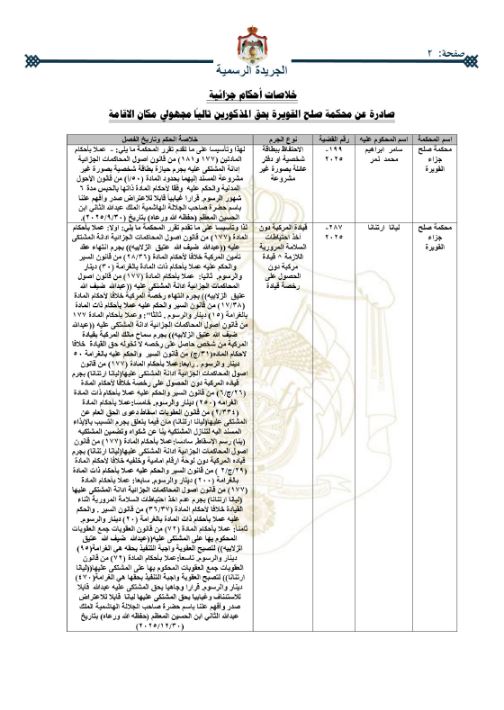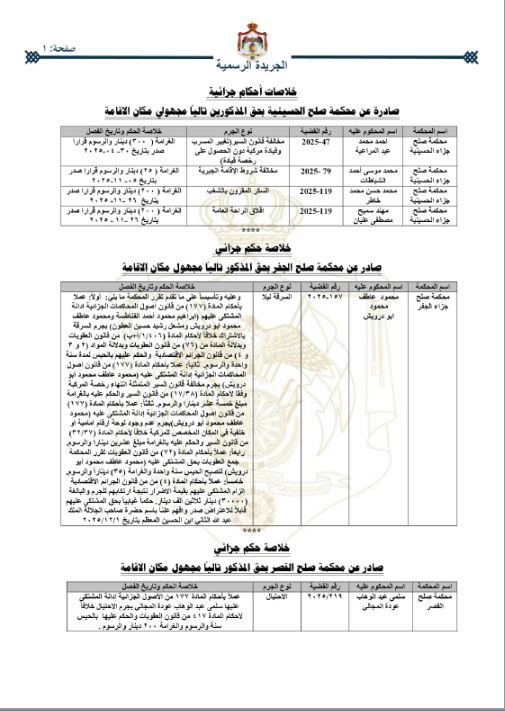 شمل عدد الجريدة الرسمية، اليوم الخميس، أسماء أردنيين مجهولي مكان الإقامة صدرت بحقهم أحكام قضائية؛ شملت الحبس بمدد زمنية متفاوتة، وغرامات مالية.