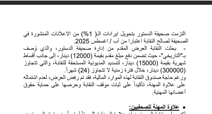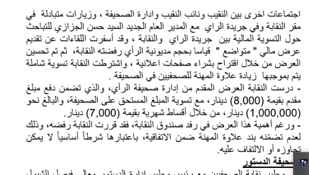 وعرضت صحيفة الرأي مبلغ (8000) دينار مع تسوية المبلغ المستحق والبالغ مليون دينار، من خلال أقساط شهرية (8000) دينار، وربطت النقابة ذلك بعلاوة المهنة، ... انتهاء موعد السداد ... بعد (10 سنوات)، وصحيفة الدستور قدمت عرضا بقيمة 12000 دينار لتسديد المديونية 30000 خلال فترة زمنية لا تتجاوز 24 شهرا .. المهم ماهي الخطوات القادمة ..!