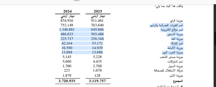 لا يزال مجلس نقابة الصحفيين يحاول تحصيل حقوق النقابة (1%) على الصحف بدل الإعلانات منذ زمن طويل، وقد كشف التقرير السنوي لنقابة الصحفيين لعام 2025 أن الإيرادات غير المحصلة عن سنوات سابقة، وصلت لحوالي 3.3119757 مليون، والديون على جريدة الرأي 461.911، والدستور 505.488 والغد 258 والقنوات الفضائية والراديو 703.840وفق التقرير.