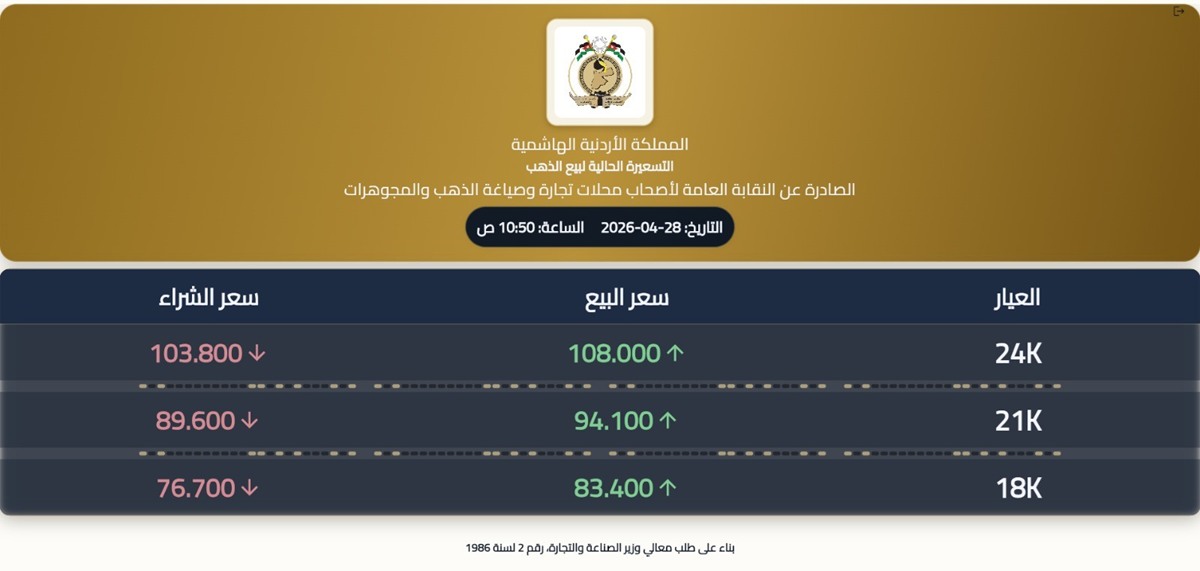 شهدت أسعار الذهب في الأردن، اليوم الثلاثاء، تراجعًا ملحوظًا في بعض العيارات، وفق التسعيرة الصادرة عن النقابة العامة لأصحاب محال تجارة وصياغة الحلي والمجوهرات.