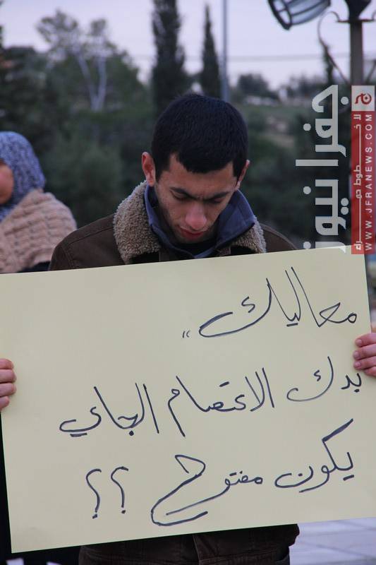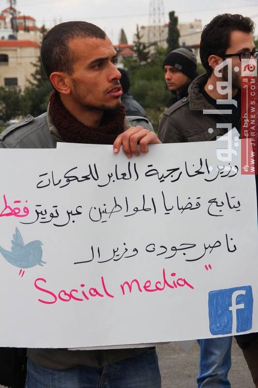ورفعوا المشاركون في الاعتصام يافطات منها: "ناصر جودة خرج ولم يعد"، و"الحرية خالد الناطور"، و"وزير الخارجية عابر للحكومات يتابع قضايا المواطنين عبر التويتر"، و"ناصر جودة وزير السوشيل ميديا".