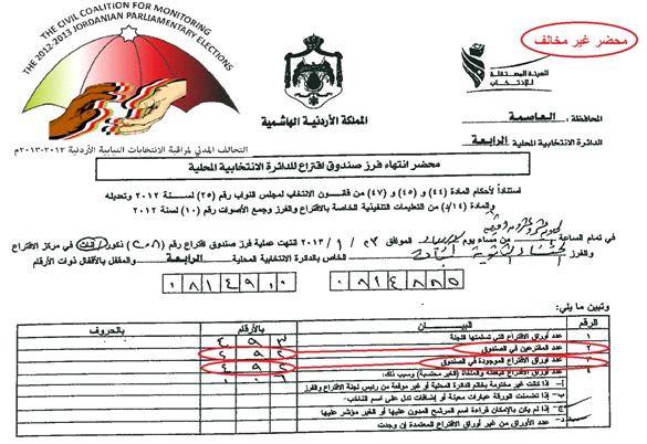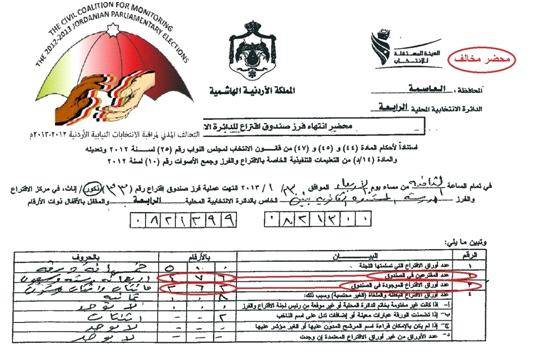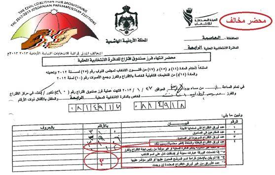 كما أن الصندوق رقم (33) في الدائرة الرابعة من محافظة العاصمة، وجد وفقا لمحضر الفرز الخاص بالدائرة الانتخابية المحلية أن عدد المقترعين في الصندوق (476) مقترعا، بينما كان عدد أوراق الاقتراع التي وجدت في الصندوق (262) ورقة اقتراع، أي انه هناك (214) ورقة اقتراع مجهولة المصير في ذلك الصندوق.