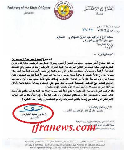 ووفق هذه الورقة - التي ظهر عليها سوء التزييف بوضوح عبر طلاء الاسم الحقيقي للوثيقة بالطامس الابيض ووضع اسم وتوقيع السفير زايد بن سعيد الخبارين ثم كتابة النص المراد احتواء الوثيقة عليه - فقد تم عرض هذا "الموضوع على المسؤولين الأمريكين بأن تقوم دولة قطر بتمويل إنشاء هذه المعسكرات وتقديم كل أشكال الدعم المالي واللوجستي اللازم لاستقدام المقاتلين من الدول العربية والإسلامية بعد موافقة الجانب الإسرائيلي".