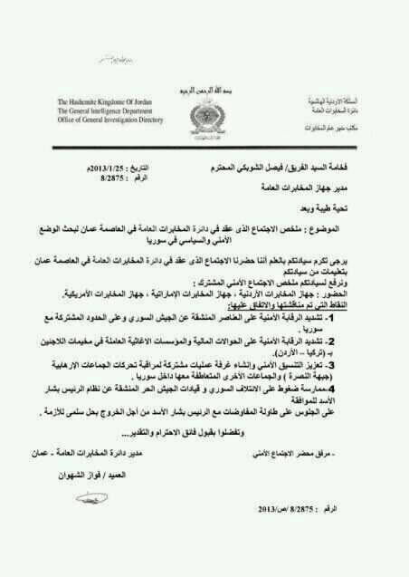 ووفق ما زعمت الوثيقة فان كل من اجهزة المخابرات الاردنية والاماراتية والامريكية شاركت في الاجتماع.
