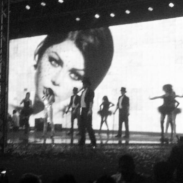 أما في الصورة الثانية فظهرت وهبي على المسرح بالأبيض والأسود بإستعراض مع فرقة راقصة.