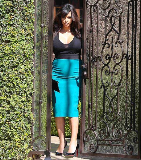 ويبدو أن كيم لا تستطيع ان تستغني عن ملابسها الضيقة حتى أثناء حملها ، فظهرت بتنورة لونها" توركواز " ضيقة ذي خصر عالٍ وبلوزة سوداء اللون شفافة ، مع حذاء ذي كعب عالٍ من Christian Louboutins.