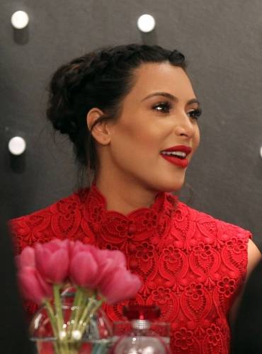وماكياج كيم زاد إطلالتها جمالاً خصوصاً مع أحمر الشفاه الأحمر والضفائر التي تلاءمت مع شكل وجهها .
