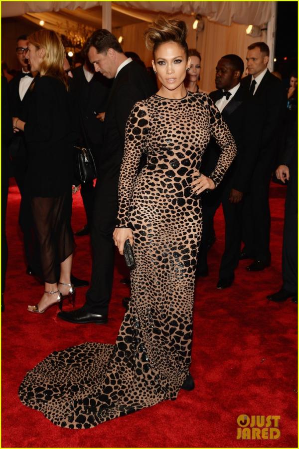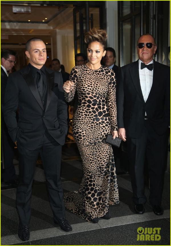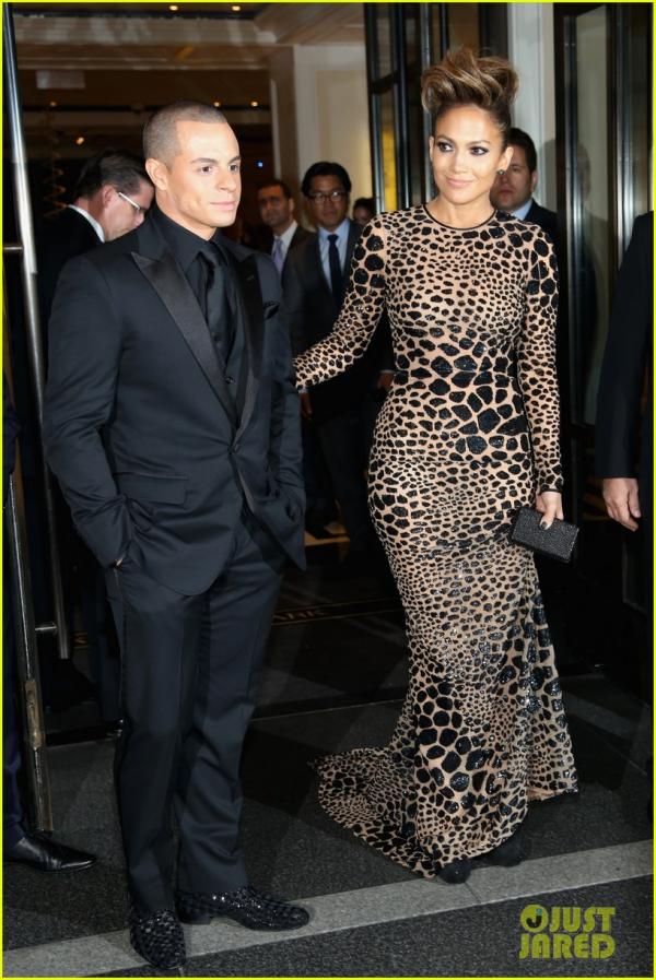 لوبيز أرتدت فستان مطرز بطبعات جلد النمر طويل ضيق عاري الظهر، جعلها تبدو أكثر إثارة وابرز تناسق قوامها، بينما ارتدى كاسبر بدلة كلاسكية سوداء بدا فيها أكثر وسامة.