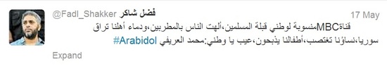 "قناةMBCمنسوبة لوطني قبلة المسلمين،ألهت الناس بالمطربين،ودماء أهلنا تراق سوريا،نساؤنا تغتصب،أطفالنا يذبحون،عيب يا وطني:محمد العريفي #Arabidol".