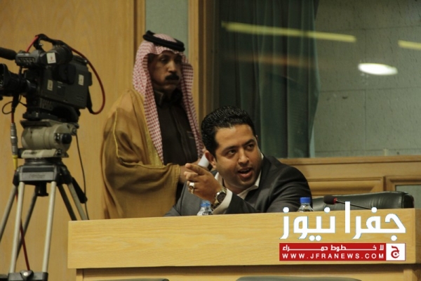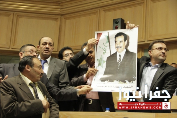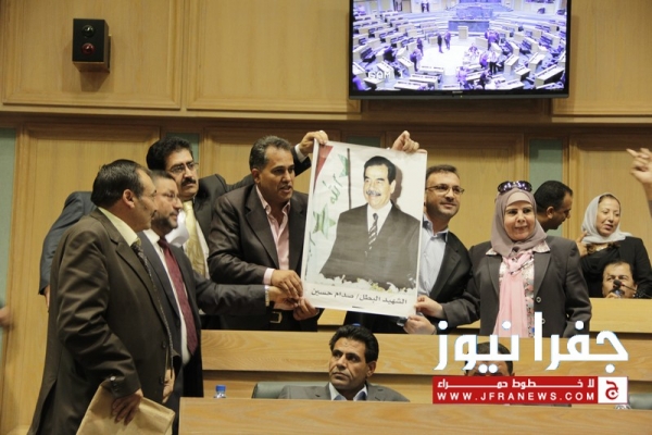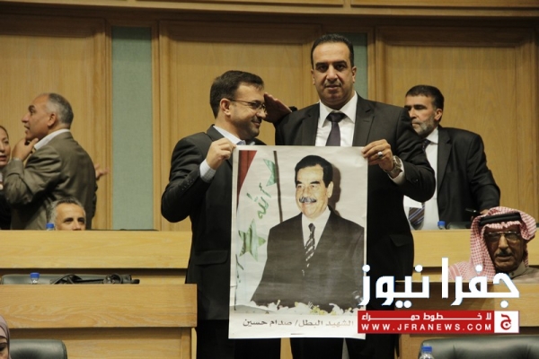 ورفع النواب عبد المحسيري واحمد هميسات ونعايم العجارمه وزكريا الشيخ وعساف الشوبكي ومازن الجوازنه ومحمد الظهراوي وقصي الدميسي وطلال الشريف، واحمد الجالودي، ونواب اخرين صورة كبيرة لصدام حسين تحت قبة المجلس.