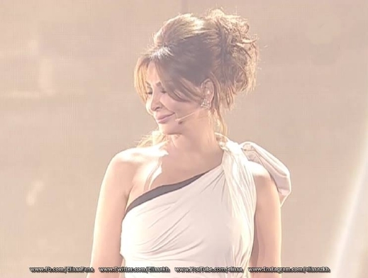 الفستان أبيض اللون من ماركة Lanvin مصنوع من القطن المطاط بكتف واحد من تصميم ألبير الباز، ويتميز بعقدة عند الخصر لتظهر جمالمنحنيات الجسد. من المعروف أن إليسا تشارك في لجنة تحكيم "XFactor" مع النجوم وائل كافوري وحسين الجسمي وكارول سماحة.