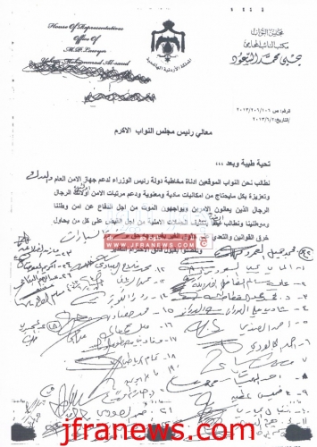جفرا نيوز - جفرا نيوز - وقع 48 نائبا على مذكرة تبناها النائب يحي السعود وتطالب بـ دعم جهاز الامن العام والدرك وتعزيزه بكل ما يحتاج من امكانيات مادية ومعنوية ودعم مرتبات الامن جراء معاناتهم الامرين ويواجهون الموت من اجل الدفاع عن امن الوطن .