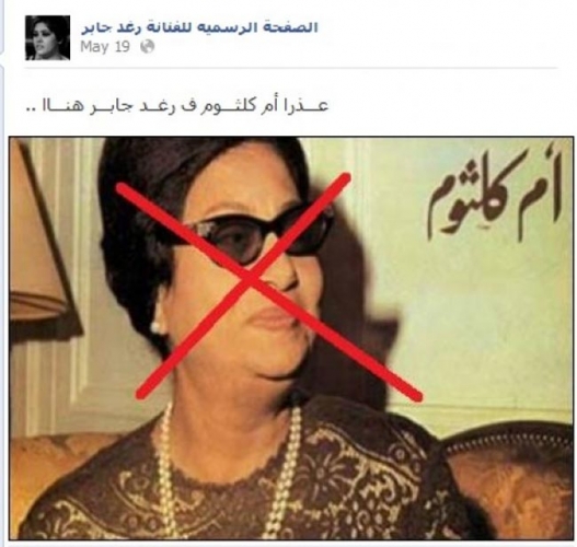 وفي سياق اخر هاجمت رغد عبر صفحتها على الفيسبوك سيدة الغناء العربي كوكب الشرق أم كلثوم وكتبت تحت صورتها "عذرا أم كلثوم فرغد الجابر هنا”.