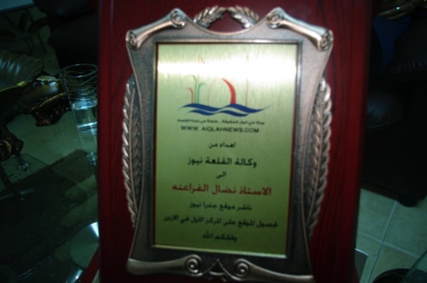مدير عام موقع "القلعة نيوز" قدم درعا تذكاريا للزميل نضال فراعنة مبديا اعتزاز الموقع وفخره الشديد بزيارة مالك موقع "جفرا نيوز" متنمين له مزيد من التقدم والنجاح.