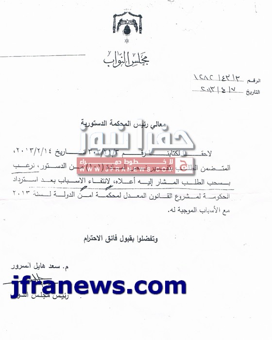 السرور في كتابة الثاني الذي حمل الرقم 3/42/1282 وصدر بتاريخ 7/4/2013 برر طلب سحب التفسير " لانتفاء الاسباب بعد استرداد الحكومة لمشروع القانون المعدل لمحكمة امن الدولة لسنة 2013 مع الاسباب الموجبة .