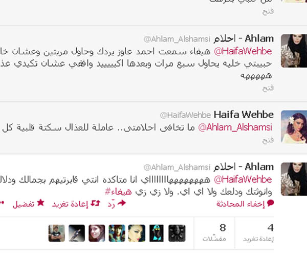 في محادثة ثنائية على تويتر أعربت أحلام عن حبها لصديقتها هيفاء عبر مناشدتها العودة لطليقها أحمد أبوهشيمة قائلة: « هيفاء سمعت أحمد عاوز يردك وحاول مرتين وعشان خاطري حبيبتي خليه يحاول سبع مرات وبعدها أكيييييد وافقي عشان تكيدي عذالك هههههه».