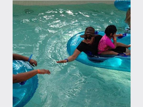 ظهرت أحلام في الصور إلى جانب إبنتيها فاطمة ولؤلؤة، داخل حوض السباحة الذي تزينه ألعاب وديناصورات ضخمة.