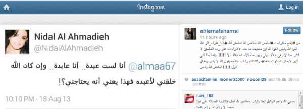 أثارت فيها حفيظة أحلام التي أرفقت الصورة بتعليق ضمت إليه إسم النجم اللبناني راغب علامة قالت فيها "من أبشع ماقراءت!! استغفر الله استغفر الله استغفر الله . كلنا_فقراءالى الله اتقوا الله ياناس اتقوا الله اين مشايخنا ما هذه الافتراءات على رب العالمين لا أنشر هذا لأن في خلاف بيني وبين هذه الانسانهلا !! وإنما هذا شي كبير لايمكن السكوت عنه. حراااااااام راغب علامه يقول الله لا يقدر ونضال تقول !!!!! استغفر الله ياناس"