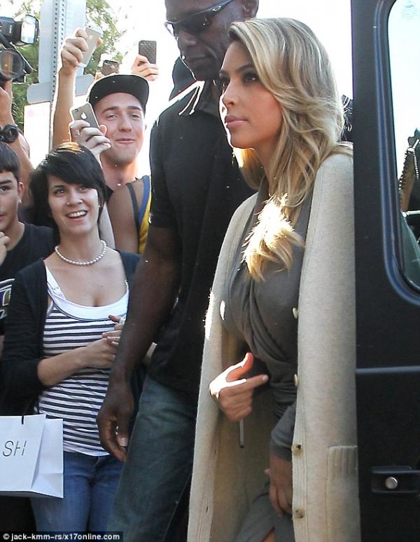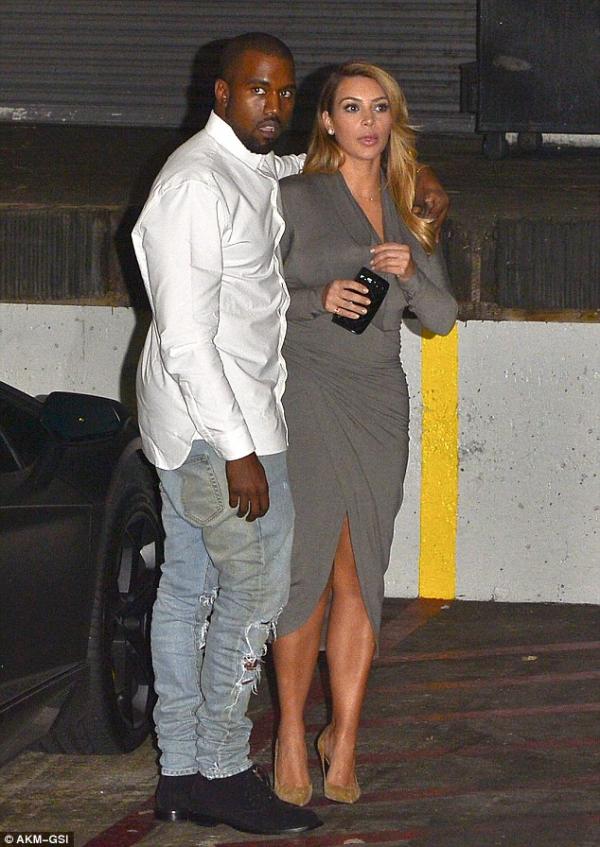 وكان لا بد لكيم أن تظهر بأجمل إطلالاتها من أجل حبيبها حيث انها ارتدت فستاناً رمادياً من مجموعة Donna Karen لشتاء 2013.