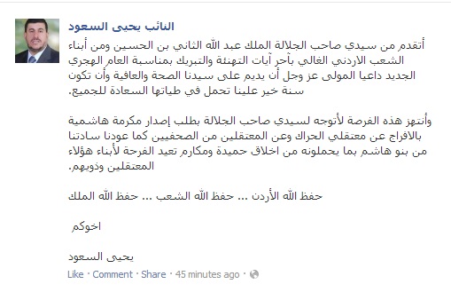 ناشد النائب يحيى السعود جلالة الملك عبدالله الثاني بالافراج عن معتقلي الرأي من الحراك والصحفيين وذلك عبر كلمة كتبها على الفيسبوك للتهنئة برأس السنة الهجرية .