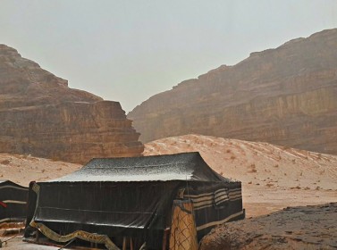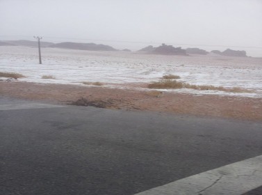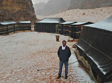 ولأول مرة منذ عشرات السنين اكتست كذلك جبال وادي رم باللون الأبيض، وتحولت رمالها الذهبية إلى بساط أبيض افترش الأرض منذ ساعات الصباح الأولى، نتيجة كثافة كميات الثلوج المتساقطة على المنطقة.
