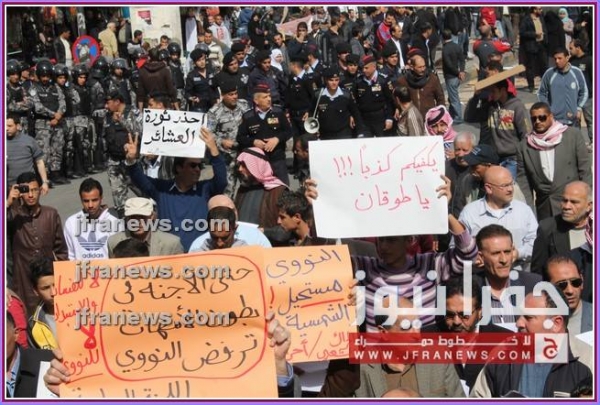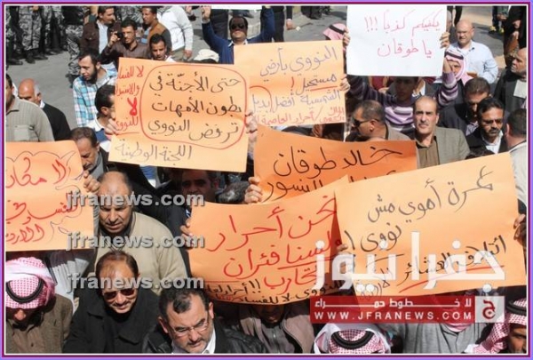 وهتف المحتجون بالقول: "يا نووي غور غور إحنا مش خامس طابور" و"كيري ونووي ما بدنا الشعب مل من السكوت يافاسد يالله غور خلي الشعب يشوف النور".
