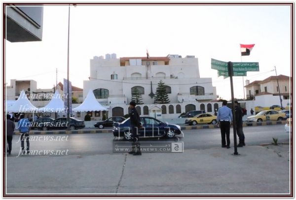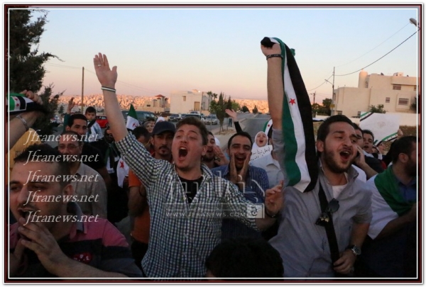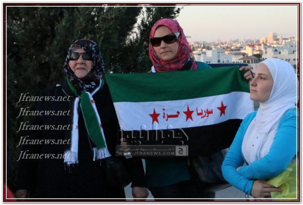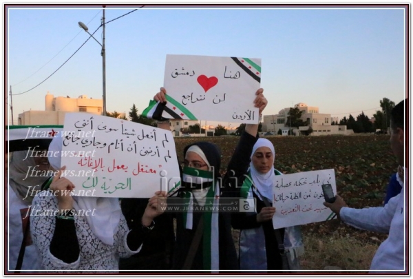 بالصور : سوريون يبتهجون بطرد سفيرهم ويشكرون الأردن امام سفارتهم