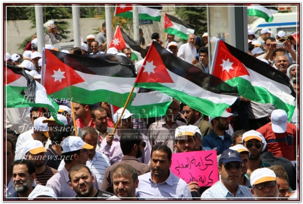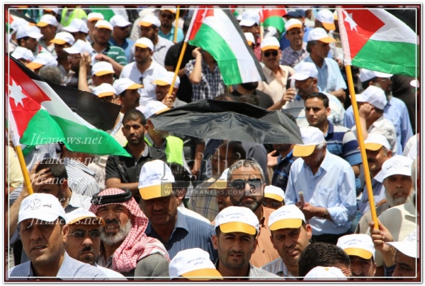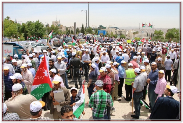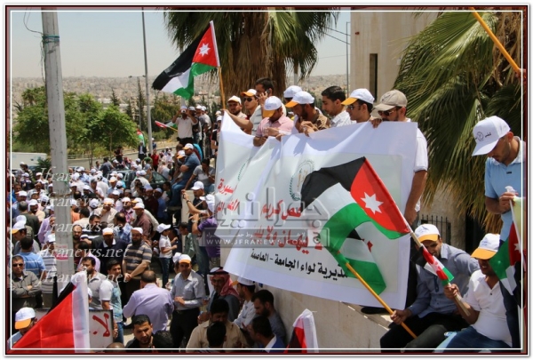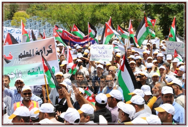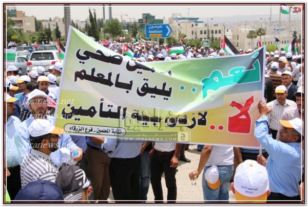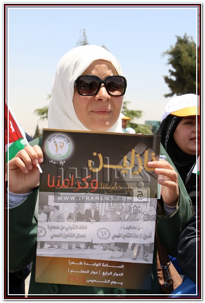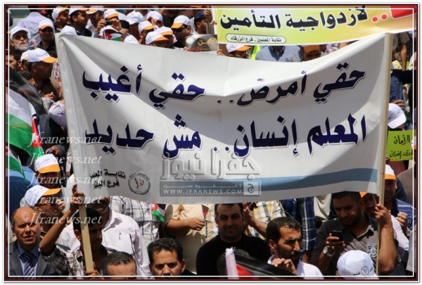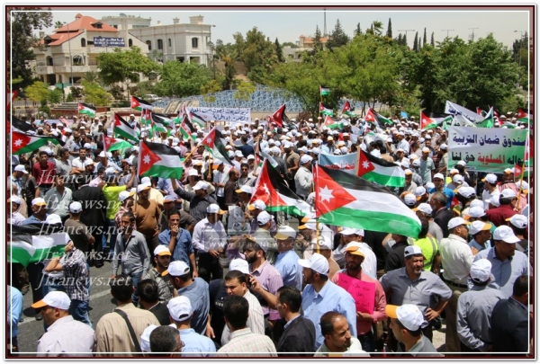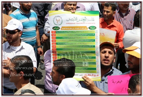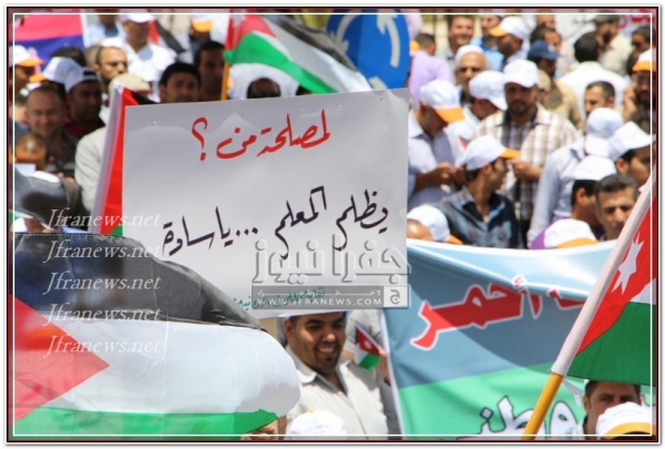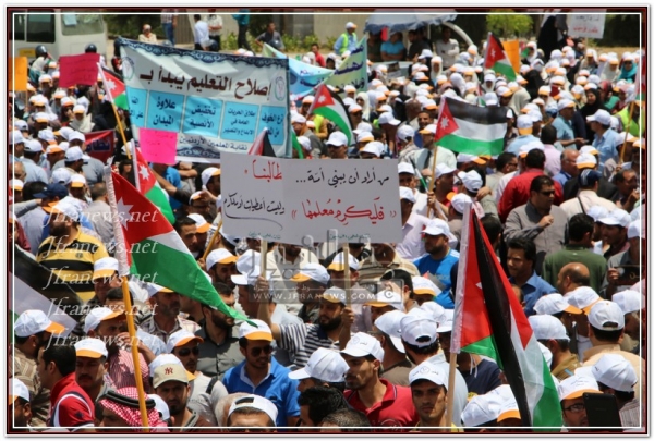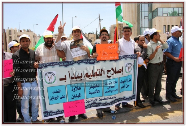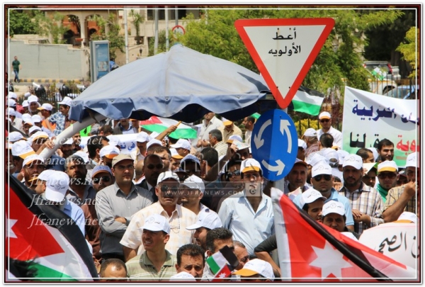 نظم الآلاف من معلمي الاردن ظهر الاحد اعتصاماً حاشداً بالقرب من مقر رئاسة الوزراء على الدوار الرابع في العاصمة عمان مطالبين بقانون عادل يحمي المعلم ويضمن حقوقه الوظيفية.
