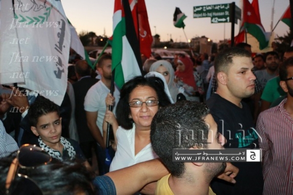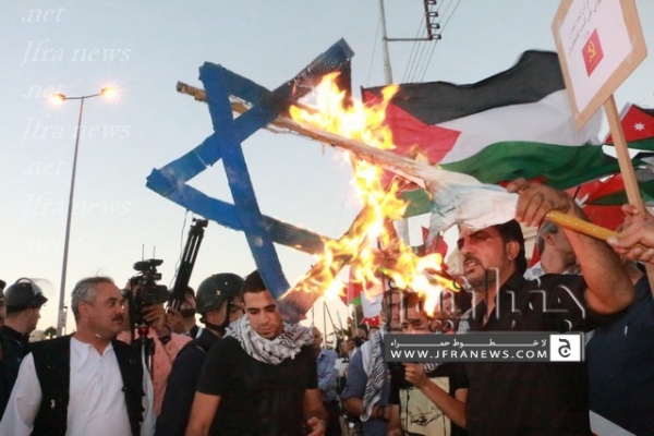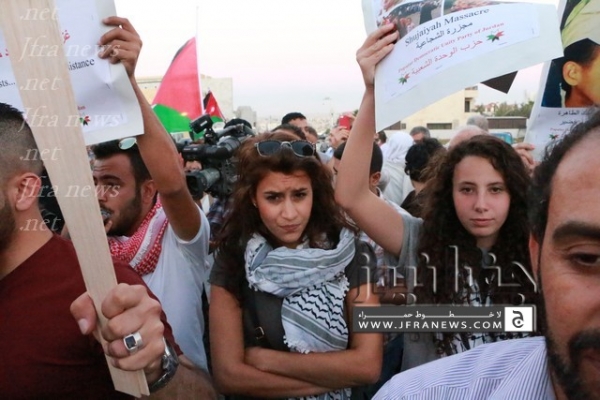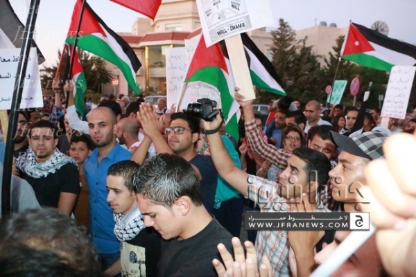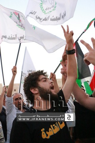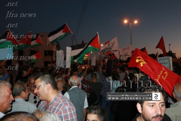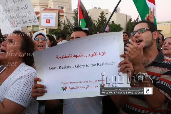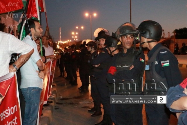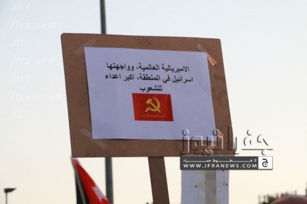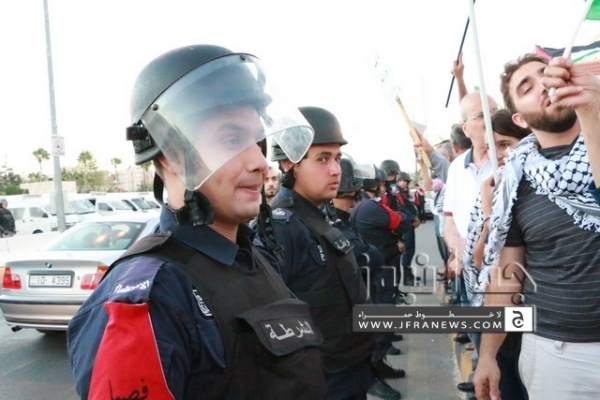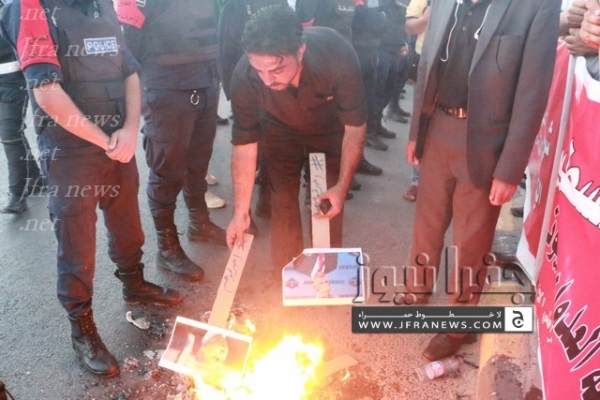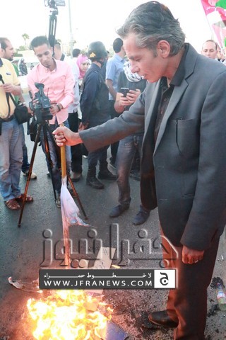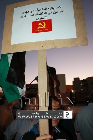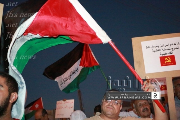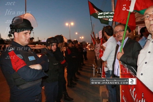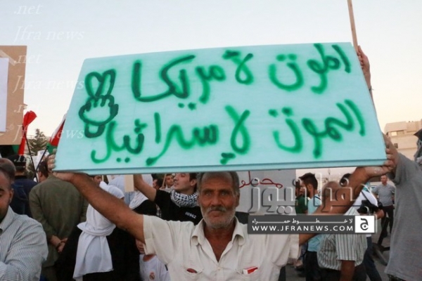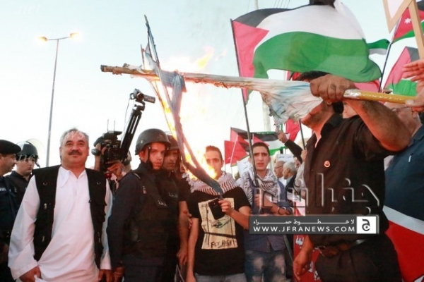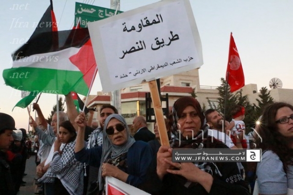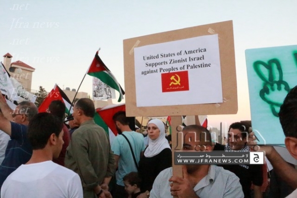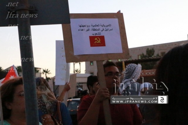 نفذ المئات من اعضاء الحزب الشيوعي الاردني وقفة غضب امام السفارة الامريكية مساء الاحد ،عقب تصريحات رئيس الوزراء الدكتور عبدالله النسور بعدم استدعاء السفير الاردني من اسرائيل . وطالب المشاركون بطرد السفير الاسرائيلي والامريكي فورا وسحب سفيرنا من تل ابيب تعبيرا عن حفظ كرامة دماء الشهداء في غزة المنكوبة. ونددوا بالمجازر الصهيونية والاعتداء الوحشي البربري الغاشم على اهالي قطاع غزة مطالبين المجتمع الدولي والعربي برفع الحصار عن اهالي القطاع بالسرعة القصوى. وفور وصول المحتجين الذين تواجدوا بشكل مفاجئ امام محيط السفارة هرعت قوات الدرك ورجال الامن مشكلةً طوقأ امنياً على محيط السفارة تحسباً لأي اعتداء على السفارة وكوادرها. وصدحت حناجر المشاركين بالهتافات التي حيت المقاومة الفلسطينية الباسلة واستنكرت صمت وتخاذل الحكام العرب على حد وصفهم. ومن هتافاتهم : امريكا راس الحية .. امريكا اصل الارهاب .. من عمان تحية .. لغزتنا الابية . لا سفارة صهيونية .. على الاراضي الاردنية . وقاموا بحرق العلم الامريكي والصهيوني تعبيراً عن غضبهم ورفضهم ازاء ما يحدث بغزة. وقال احد المشاركين انهم لن يتوانوا عن خدمة الفلسطينيين خاصة قطاع غزة الذي يشهد منذ 28 يوماً اعنف طرق القصف ووحشية منقطعة النظير. وكان رئيس الوزراء الدكتور عبدالله النسور اكد خلال جلسة بدار رئاسة الوزراء الاحد ان سحب السفير لا يحتاج سوى تلفون ولكن بحساب الارباح والخسائر من يربح ومن يخسر من عملية سحب السفراء. واضاف 'ان سفيرنا موجود لخدمة مصالح ابناء الضفة الغربية الذين تمر طريقهم فقط من الاردن وكذلك الامر بالنسبة لبضائعهم ودوائهم وسفرهم ورحلاتهم الى العمرة والحج والامر ينطبق ايضا على ابناء عرب ال 48 وقطاع غزة'. - f