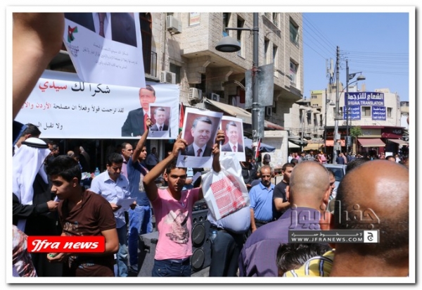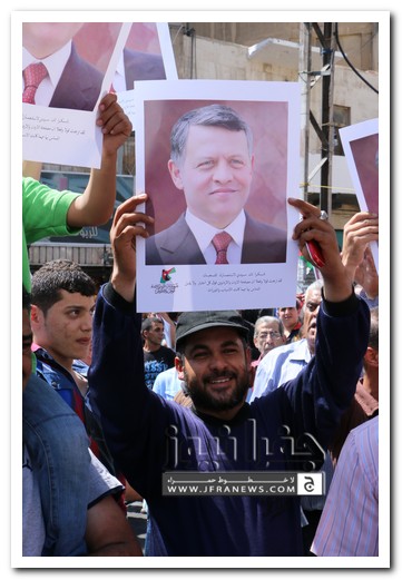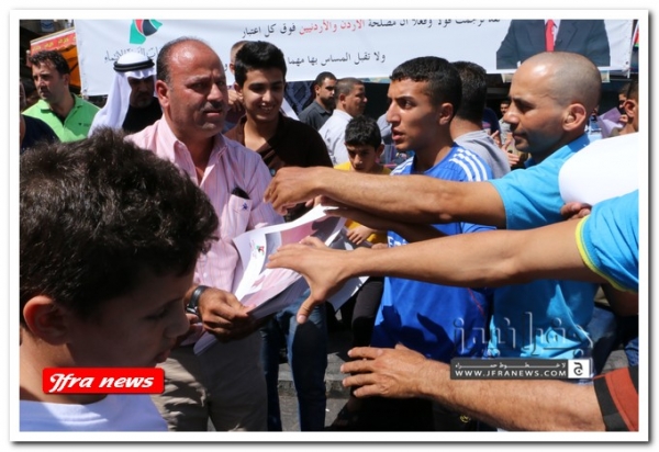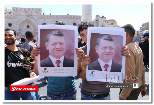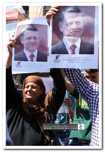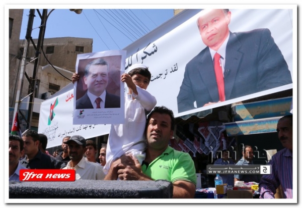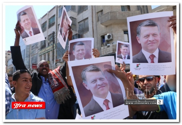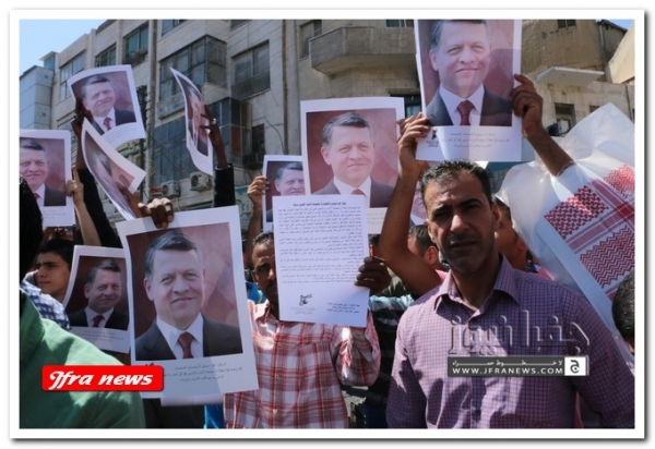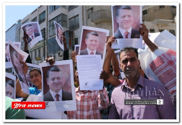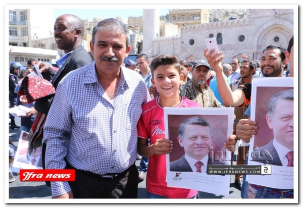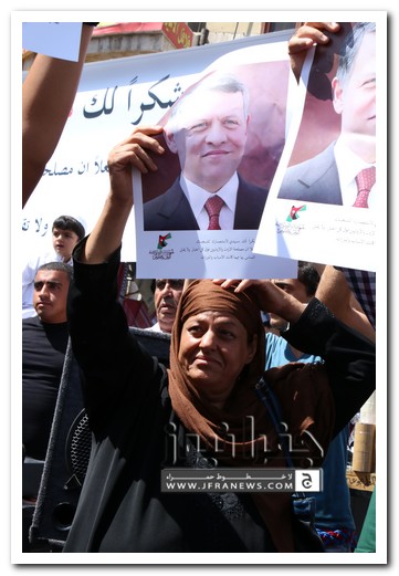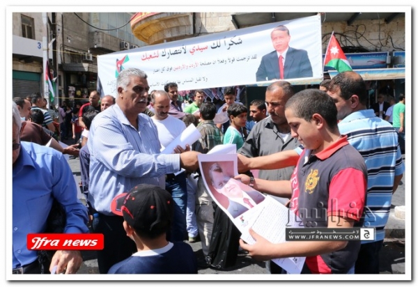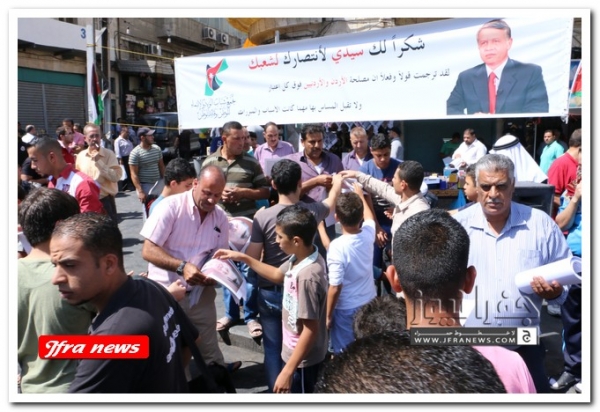 جفرا نيوز اوسيد صبيحات اقام تجمع شباب الولاء والانتماء وقفة شكر للملك على رد مشروع قانون التقاعدي للنواب والاعيان حيث قام التجمع بتوزيع بيان وصور جلالة الملك