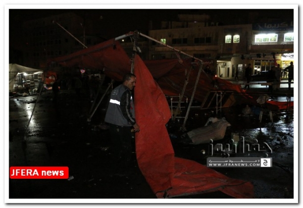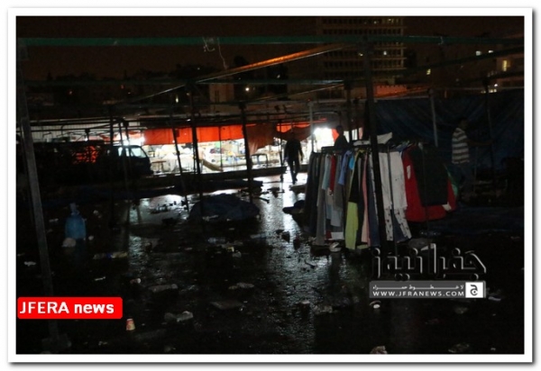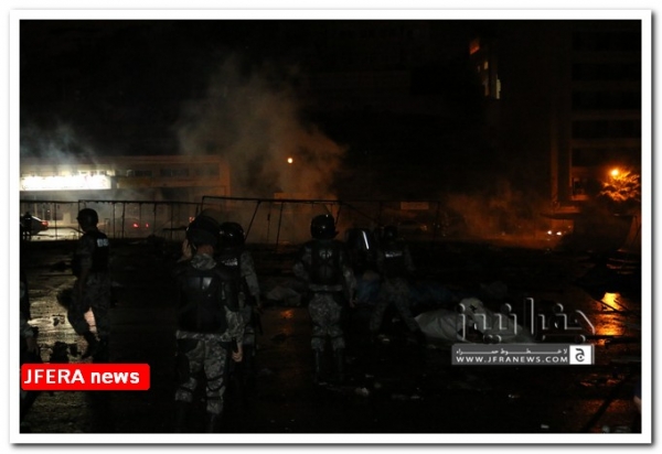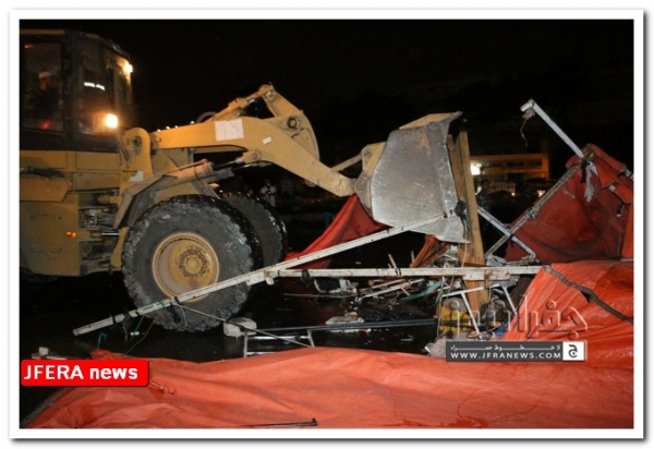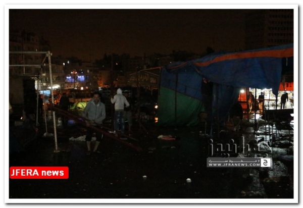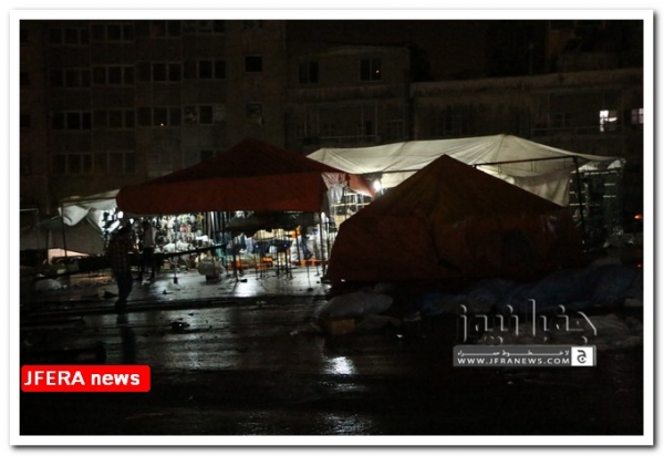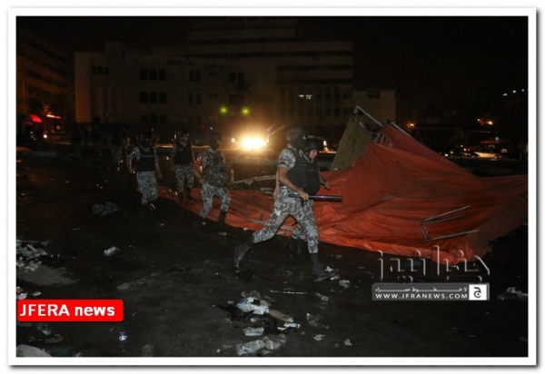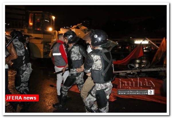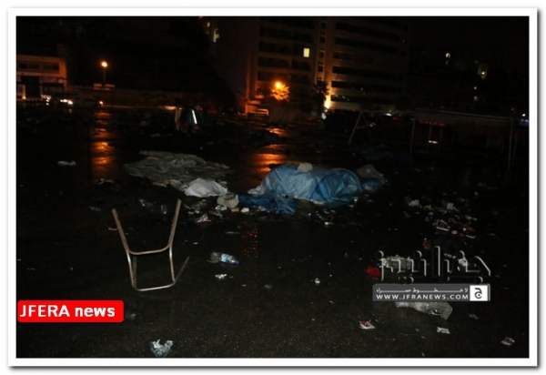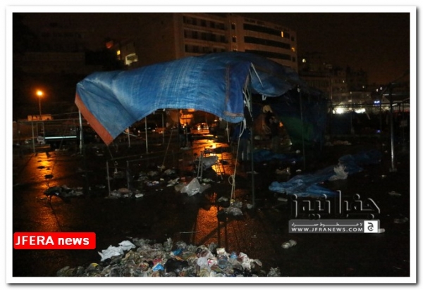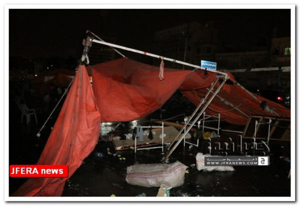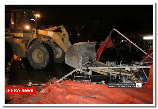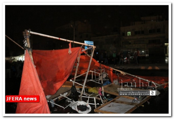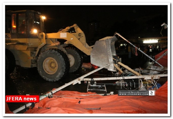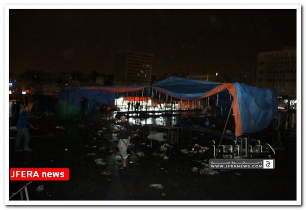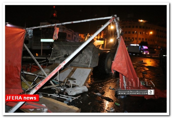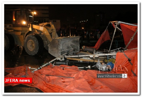 وتواجدت قوات الأمن وكوادر من الأمانة لتنفيذ الإخلاء بعد الساعة الثانية عشرة ليلاً إلا أن الأمطار الغزيرة فرقت المعتصمين وأخلت جزءاً كبيراً من بسطاتهم، لكنهم عاودوا الوقوف في وجه عملية إزالة الجرافات لخيمهم.
