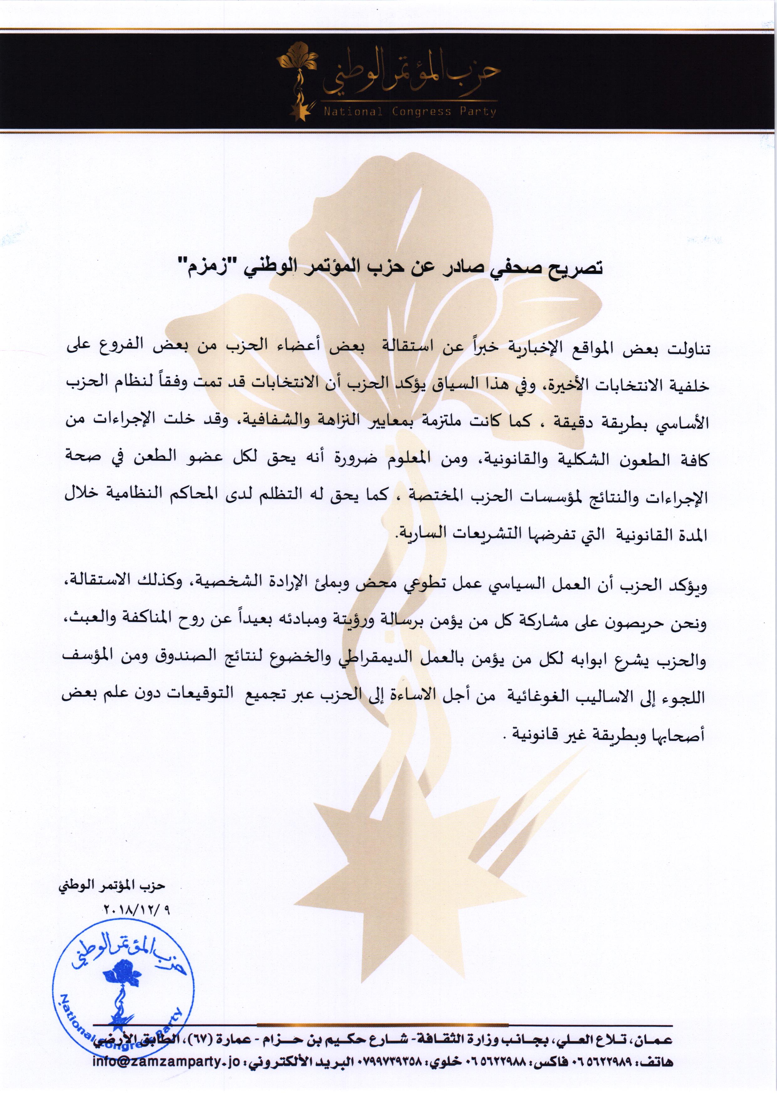 بيان صحفي من حزب المؤتمر الوطني زمزم