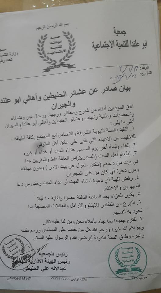 بيان صادر عن عشائر الحنيطين واهالي ابو علندا