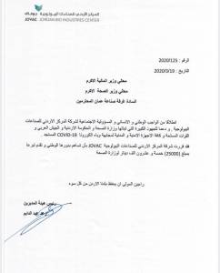 شركة المركز الاردني للصناعات البيولوجية تتبرع بمبلغ 25000دينارلمجابهة وباء كورونا المستجد