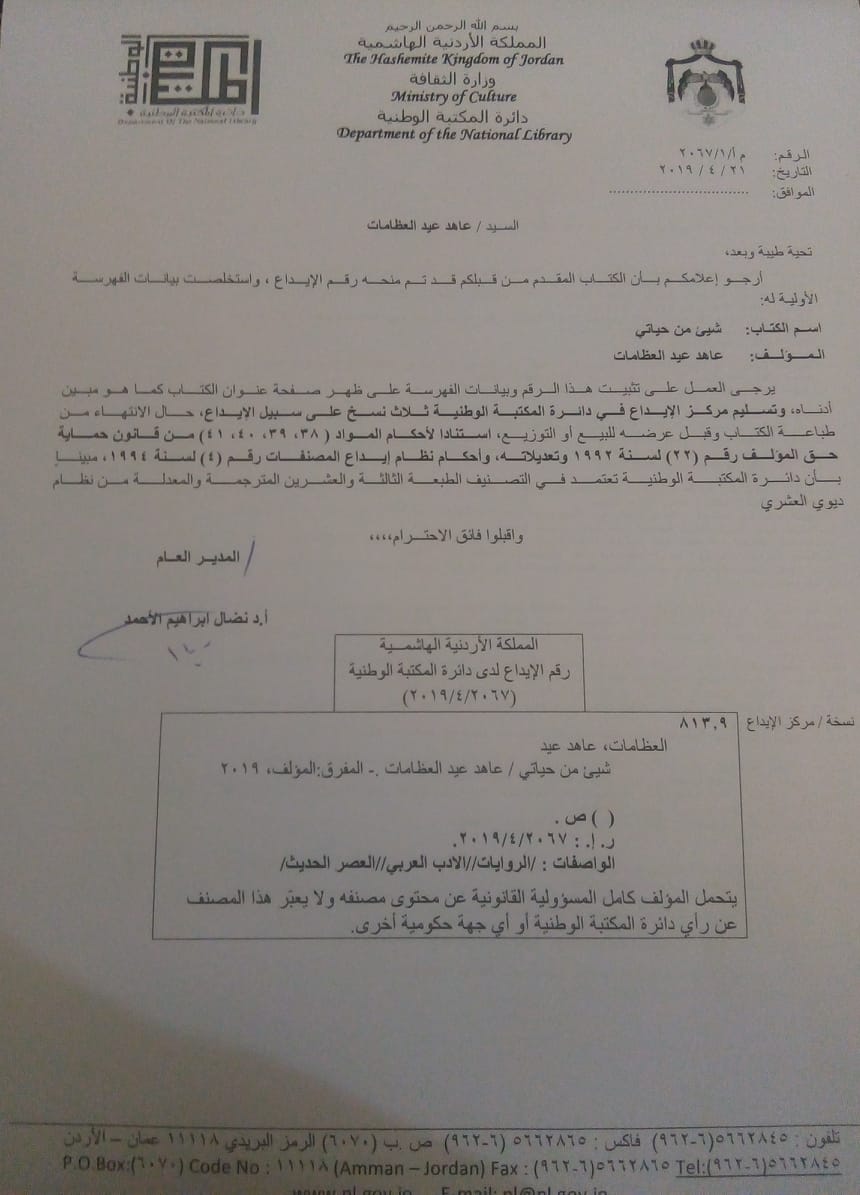 رواية "شيء من حياتي" إصدار جديد للكاتب عاهد العظامات