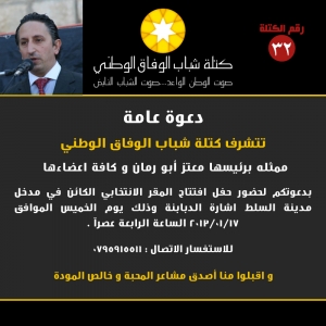 كتلة شباب الوفاق الوطني تفتتح مقرها في السلط الخميس