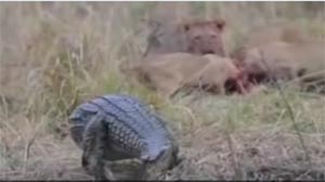 بالفيديو.. تمساح يُهاجم مجموعة من الأسود ليشاركهم صيدهم في معركة عنيفة