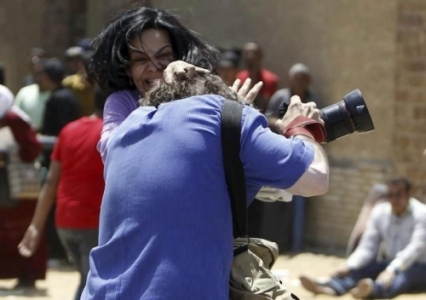شاهدوا بالصورة ما ذا فعلت إحدى مؤيدات الرئيس المخلوع أثناء اعتدائها على أحد المصورين أمام مقر المحاكمة