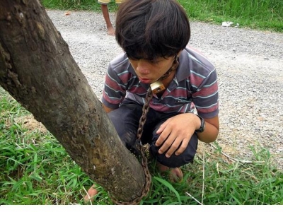 رجل يربط ابنه كالكلب بسلسلة في شجرة ..بسبب تغيبه عن المدرسة