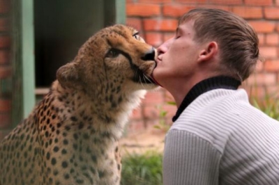 بالصور.. شاب يتبادل القبلات مع فهد مفترس هجرته أمه بعد الولادة