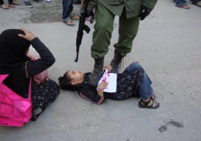 جندي اسرائيلي يضع قدمه على بطن طفلة فلسطينية . صورة تثير الغضب على facebook
