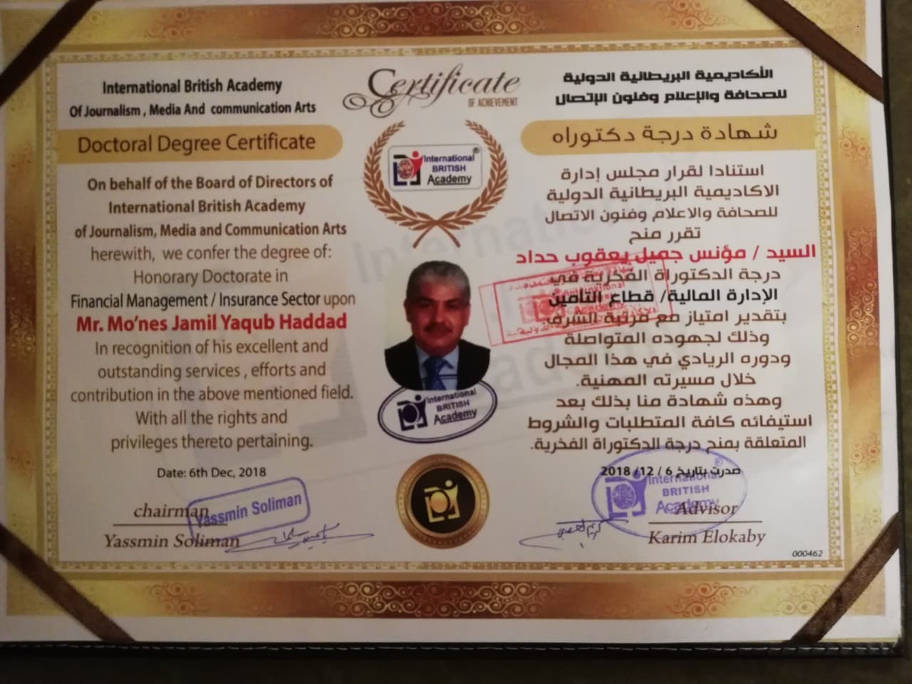 منح د.مؤنس حداد درجة الدكتوراه الفخرية بالادارة المالية