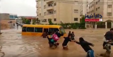 السيول تداهم باص مدرسة محمل بالاطفال و فزعة المواطنين تنقذهم - فيديو